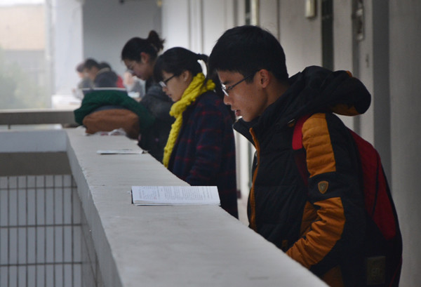 有些大三考研同学不想读书声打扰别人,便站在走廊外或者墙角读书,即使冬季人数也不会减少,成为一道动人的风景。