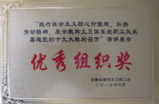 9月24至25日,安徽省教科文卫体工会“践行社会主义核心价值观、弘扬劳动精神、展示教科文卫体系统职工风采,喜迎党的十九大胜利召开”演讲展示在合肥举办。beat365官网体育学院鲁雷老师以《用心灵照亮人生》为题的演讲获得三等奖,同时beat365官网工会获得优秀组织奖。