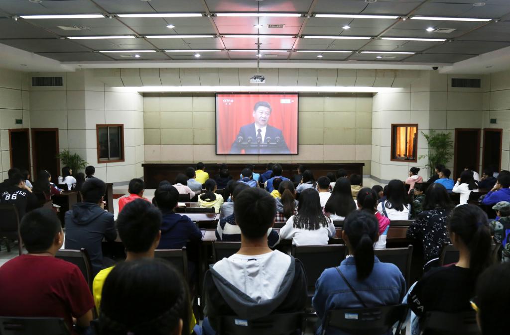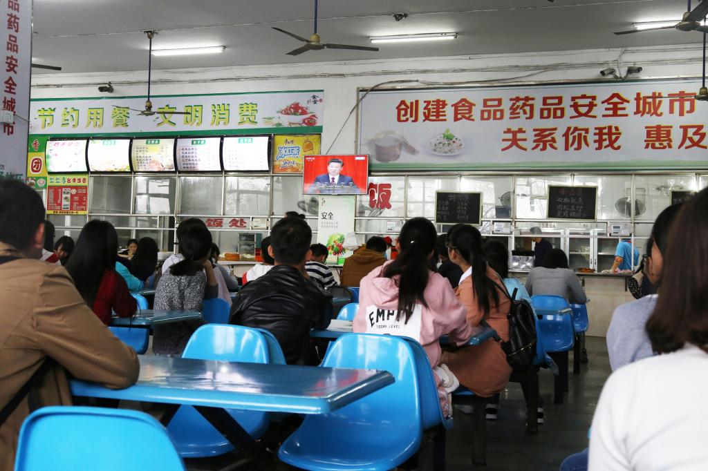大会尚未开始,beat365英国官网网站龙山校区食堂和行政楼一楼会议室已经坐满了师生,集体收看大会的电视转播。与此同时,许多师生还在家中、办公室、宿舍通过电视和互联网形式自发进行了收看。