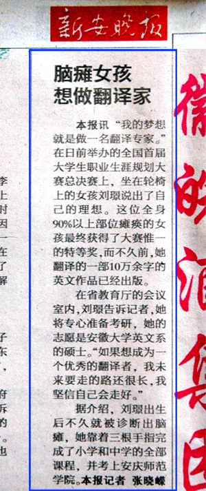 《新安晚报》、《安庆晚报》,新华网、中国教育网、中安教育网、安徽教育网等省内外主流媒体对刘璟同学事迹也纷纷进行了大篇幅报道。