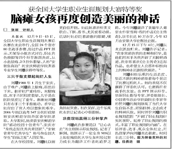 12月16日,安庆电视台《新闻联播》栏目以《安庆师范学院刘璟获全国大学生职业生涯规划大赛特等奖》为题进行了两分钟的专题报道;