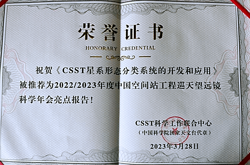3月28日,2022至2023年中国空间站工程巡天望远镜科学年会在北京召开。beat365官网数理学院方官文研究员的成果“CSST星系形态分类系统的开发和应用”荣获科学年会亮点报告奖。