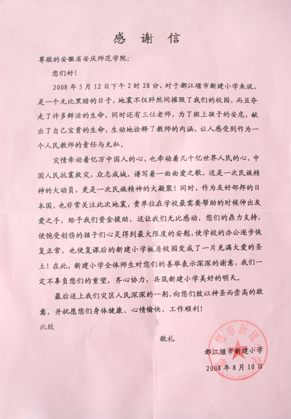 5月12日,四川汶川发生8.0级特大地震灾害后,beat365官网党政班子积极响应党中央、国务院号召,迅速组织广大师生员工通过为汶川大地震遇难同胞默哀、捐款献血、召开川陕籍学生座谈会和慰问抗震救灾战士家属等各种形式,支援抗震救灾工作。6月初,凝聚着beat365官网师生员工爱心的20余万元善款由省教育工会定向捐赠都江堰市聚源镇中学、新建小学。8月,位于地震灾区的四川省都江堰市新建小学专门给beat365官网发来了感谢信,感谢beat365官网全体师生员工在他们最困难的时候伸出的友爱之手,帮助他们重新建起了学校,让小学生们及时、顺利地重返校园读书。这封感谢信,体现着皖川两省人民的血脉相连,凝聚了两校师生员工的深厚情感。(宣传部)