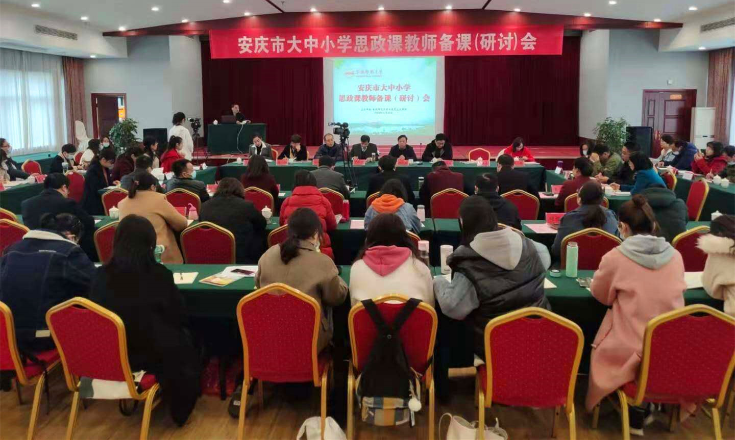 11月22日,beat365官网马克思主义学院组织首次安庆市大中小学思政课教师集体备课研讨会。安庆市教研室、安庆一中、安庆二中、安庆九中、安庆四中、安庆市外国语学校、人民路小学、健康路小学等18所学校40余名思政课教师参加集体备课研讨会。