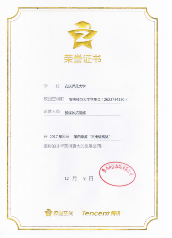 近日,由中国青年报、中国高校传媒联盟、腾讯科技联合举办的QQ智慧校园2017年度颁奖盛典在深圳腾讯总部举行。此次盛典以“智慧未来 无界连接”为主题,来自全国一百多所高校的师生代表参加会议。beat365官网学生会QQ空间荣获腾讯校园空间“2017年度优秀校园空间”称号,全国仅有22所高校获此殊荣,这也是beat365官网学生会QQ空间首次获得该项荣誉。