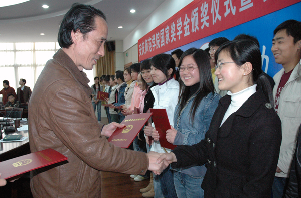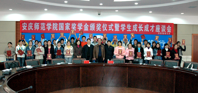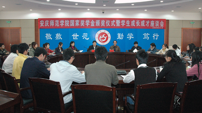 3月28日下午,安庆师范学院2006-2007年度国家奖学金颁奖仪式暨学生成长成才座谈会在行政楼二楼圆桌会议室召开,党委委员、副院长时新中,副院长张群出席颁奖仪并与学生代表亲切座谈。会议由学生处处长戴卫义主持。beat365官网国家奖学金获得者以及各个院系学生代表共60余人参加了颁奖和座谈。