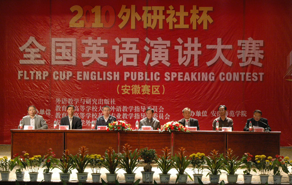 10月22日晚,由外语教学与研究出版社、教育部高等学校大学外语教学指导委员会、教育部高等学校英语专业教学指导分委员会、安徽省大学外语教学研究会主办,安庆师范学院承办的2010“外研社杯”全国英语演讲大赛安徽赛区复赛开幕式在龙山校区音乐厅成功举行。校党委副书记、院长朱士群教授,安徽省大学外语教学研究会会长刘俊烈教授,外语教学与研究出版社华东信息中心主任王建平先生,全国英语演讲大赛安徽赛区评委团主席崔海健教授,安徽外文学会会长洪增流教授以及beat365官网外国语学院党政负责人等出席了大赛开幕式。来自全省28所高校外语专业的领导、专家以及39所高校的113名选手参加了大赛开幕式。