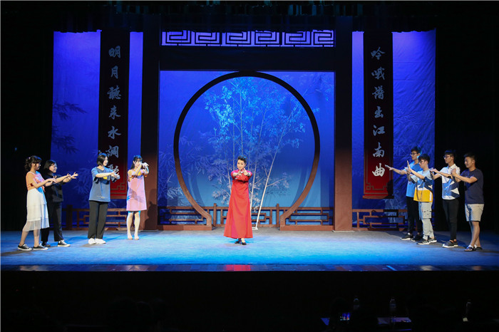 演出过半,观众热情不减,现场氛围又在国家一级演员廖琪瑛的带领下走向高潮。廖琪瑛讲解了越剧的背景、发展以及特色,并现场教唱“天上掉下了个林妹妹,似一朵轻云刚出岫”。为了让现场观众能够充分理解戏曲综合性、虚拟性和程式性这三种特色,除了通过举例说明,廖琪瑛还邀请了八位学生上台模仿“开门关门”的动作,让他们能够切身感受戏曲的艺术魅力。