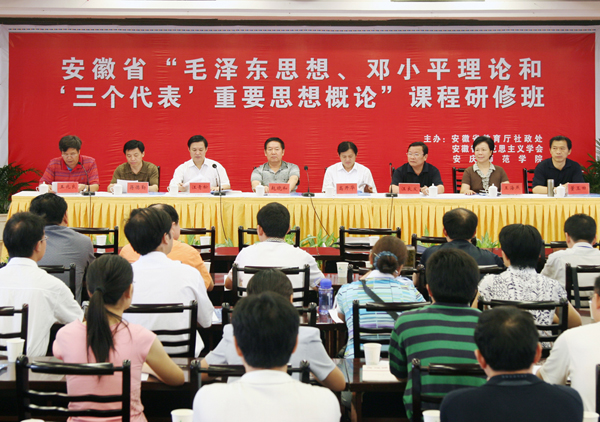 7月23日上午,由安徽省教育厅社政处、安徽省马克思主义学会、安庆师范学院联合主办的安徽省“毛泽东思想、邓小平理论和‘三个代表’重要思想概论”课程研修班在beat365官网隆重举行。中共安徽省委教育工委高开华副书记,黄山学院党委书记汪良发,安徽科技学院党委副书记蒋德勤,安徽省委讲师团副团长董玉田,安徽省马克思主义学会常务副会长、秘书长王兆良教授等专家应邀出席大会开幕式。