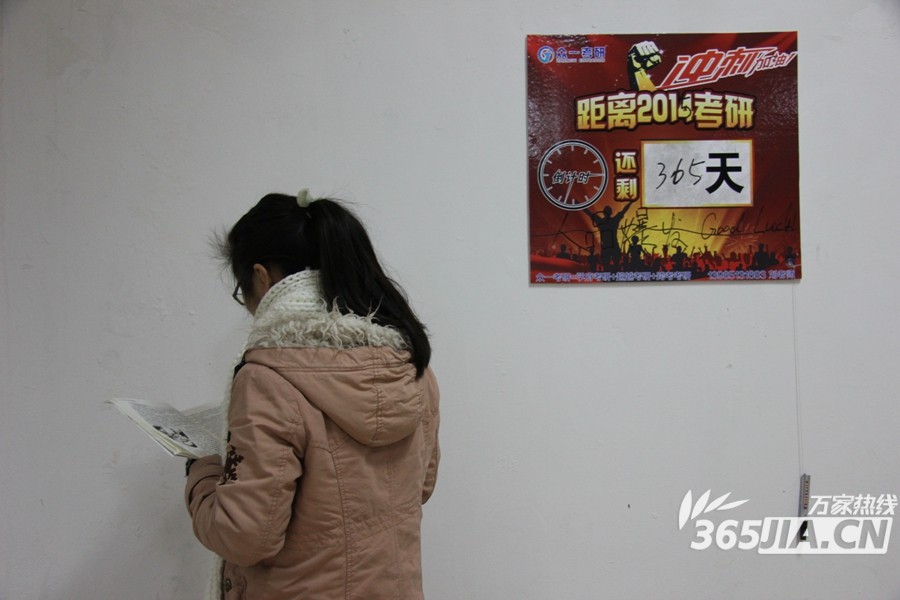 2014年1月3日,安庆师范学院龙山校区图书馆内,墙上的考研倒计时牌被学生写上了“365”天,“2014”年也被改为“2015”年。尽管2014年的考研还没开始,备战2015年考研的帷幕已经拉开。(史阳琨摄影)