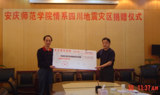随后,时新中副院长向省希望工程办公室李运铎副主任捐赠支票,并接受朱斌副书记颁发给安庆师范学院的荣誉证书。(团委)