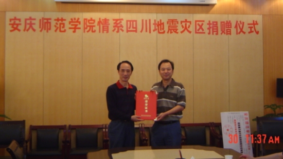 5月30日,校党委委员、副院长时新中在校团委负责同志的陪同下,专程赶到团省委,将beat365官网团员青年捐赠给四川地震灾区的243972.5元善款交给安徽省希望工程办公室,由安徽省希望工程办公室统一安排救助地震灾区。团省委副书记朱斌会见了时新中副院长一行,团省委学校部副部长李国阳陪同会见。