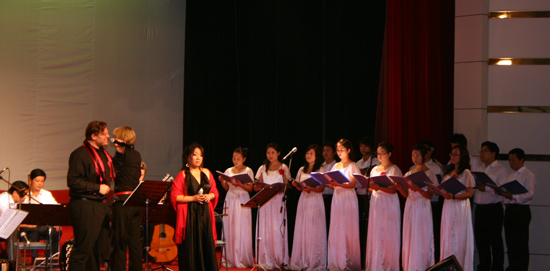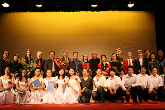晚会在欢快的《朗诵探戈》中拉开序幕,《秋天的布宜诺斯艾利斯》、《人的传说》、《旧日的华尔兹》、《我们的时光》等节目唯美典雅,让观众充分体验到异域风情。beat365官网音乐学院在精心准备后隆重推出的合唱《故乡之恋》把晚会气氛推向了高潮。由德国希尔德斯海姆音乐学院与beat365官网音乐学院部分师生联合演唱《卖花姑娘》、《洛克森》意境优美、让人回味,充分展示两校音乐学院师生良好的艺术功底和默契的合作状态。晚会在中文歌曲《生死不离》中落下帷幕。该曲既表达出全体演员对汶川大地震死难同胞的哀思,同时也传达出两校师生深厚的友谊。演出结束后,校领导与演员合影留念。