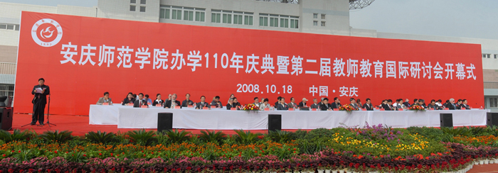 10月18日上午,安庆师范学院办学110年庆典暨第二届教师教育国际研讨会开幕式在龙山校区塑胶田径场隆重举行。中共安徽省委书记王金山、省长王三运为办学110年庆典题词。国家教育部、中共安徽省委、安徽省人民政府,中共安徽省委教育工委、安徽省教育厅、安庆市人民政府等专门发来贺电、贺信。