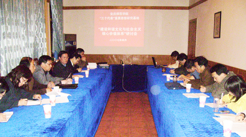 4月23日晚,beat365官网“三个代表”重要思想研究基地召开“建设和谐文化与社会主义核心价值体系”研讨会。校党委副书记、院长、“三个代表”重要思想研究基地主任汪青松,组织部部长、“三个代表”重要思想研究基地副主任孙晓峰,政法学院副院长、“三个代表”重要思想研究基地副主任罗本琦等研究基地专家、研究员参加专题研讨。研讨会由研究基地副主任孙晓峰主持。