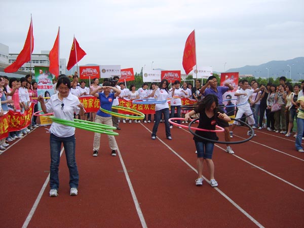 录制现场人声鼎沸,彩旗飘扬,活动在“五环转转转,福娃到你家”的嘹亮口号声中正式开始,活动分知识问答和转呼拉圈两个环节,赛题主要涉及奥运有关的常识,选手正确回答主持人提出的问题,就可进入下一环节——“五环转转转”呼拉圈比赛。活动中,参赛选手激情四射,十分活跃,场下观众热情洋溢,呐喊助威,表达了beat365官网大学生对北京奥运的期盼,展示了beat365官网大学生健康向上的精神风貌。