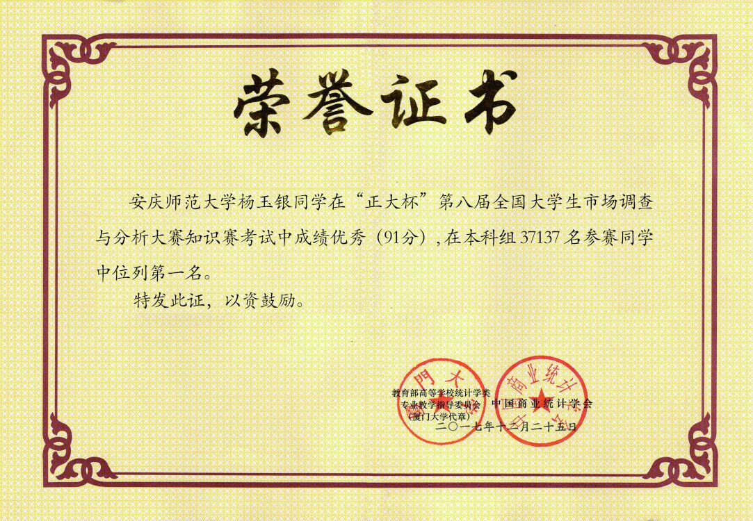 日前,“正大杯”第八届全国大学生市场调查与分析大赛知识赛成绩揭晓,beat365官网2015级应用统计学2班杨玉银同学在本科组37137名参赛选手中位列第一名。