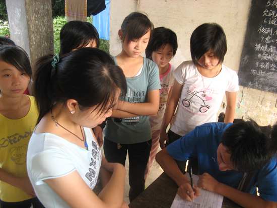 容岭村是省级新农村建设示范村,现有470户人家,加上外来人口,总计2000余人,是一个很大的村落,有的村庄甚至靠近山脚,步行路途遥远,可是实践队每位成员都不辞辛苦地进行宣传,力争不落下一户,不落下一个学生。在整个招生过程中,最大的感触就是感动:被这里学生对学习的热情感动、被这里家家户户对孩子教育的重视度感动。有的家长甚至在听晚我们宣传的当天晚上,就领着孩子过来报名了。在招生工作中,实践队还遇见这样一个女孩,她告诉我们队员,父母皆外出打工,只剩下她和爷爷奶奶在家里。她很想来驻地这里上课,可家里现正处于农忙阶段,她只能一边放牛,一边学习。了解到这个情况后,队员决定对那些无法来上课的孩子,在晚上进行一对一的上门辅导。