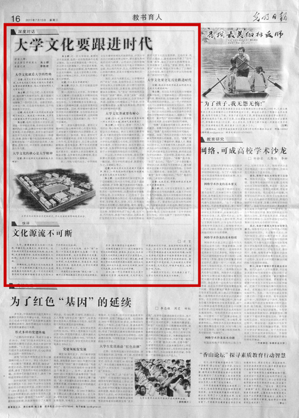 7月13日,《光明日报》“深度对话”栏目大篇幅刊登院长朱士群教授与《光明日报》记者关于“大学文化要跟进时代”的访谈文章。文章分别从“大学文化就是大学的性格”、“大学文化的核心是大学精神”、“大学文化养成要有耐心”、“大学文化要立足历史跟进时代”等4个部分对大学文化、大学精神等问题进行了深入而独到地分析,指出了大学文化建设的价值指向、大学文化的基本内涵、大学文化建设和大学精神培育的基本路径和应有态度,对高校的大学文化建设具有前瞻性和引领性。