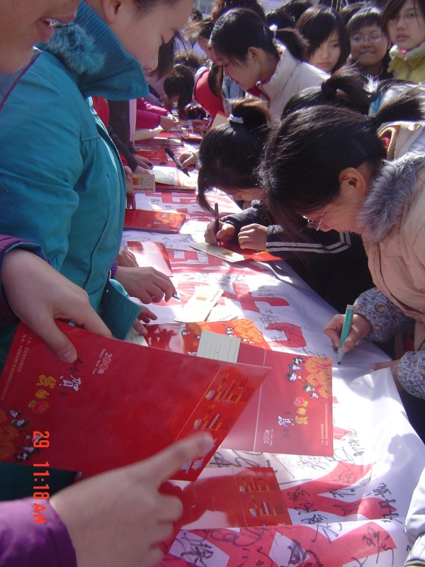 “小小贺卡 我的心”感恩活动由“我成长 我感恩”大学生主题教育活动签名仪式暨感恩贺年卡发放仪式组成,全校师生只要参与签名仪式,填写本人姓名、院系及联系号码便可免费领取一张新年贺卡。在不到一个小时的时间内共发放贺卡1500张。活动中还同时征集同学们感恩感言,他们有的感谢父母、有的感谢朋友、有的感谢自然、有的感谢恩师、有的感谢每一个对自己关心的人。在场的人都表示这样的活动是一种善意的提醒,为自己表达感恩提供了机会。