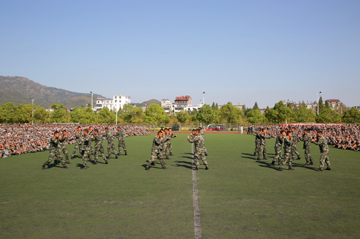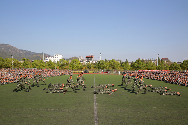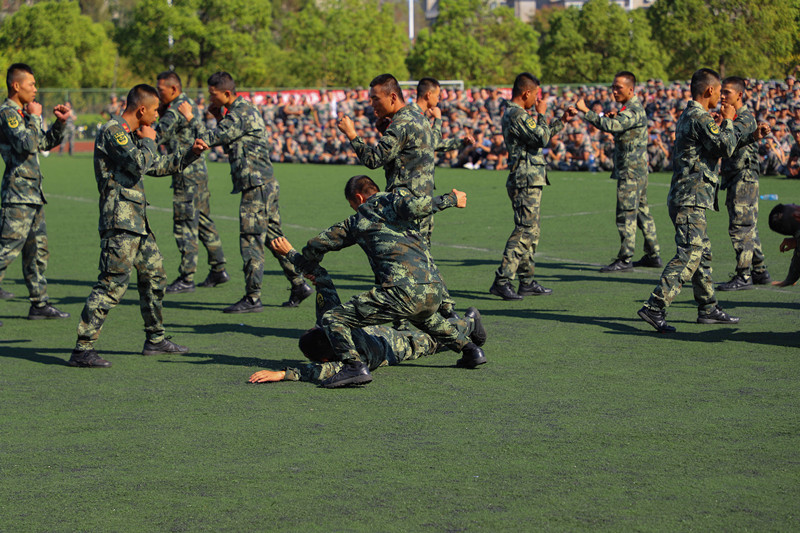 武警教官进行了擒敌拳、军体拳等精彩表演,为同学们展现了新时代军人风范,赢得全场阵阵掌声。