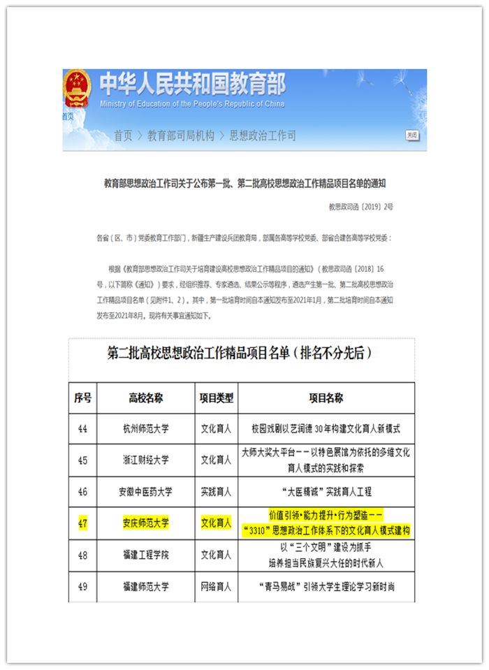 近日,教育部思想政治工作司发布《教育部思想政治工作司关于公布第一批、第二批高校思想政治工作精品项目名单的通知》(教思政司函〔2019〕2号)文件,beat365官网思想政治工作项目“价值引领•能力提升•行为塑造——‘3310’思想政治工作体系下的文化育人模式建构”喜获立项。