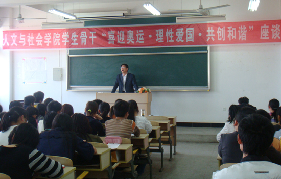 为积极帮助广大同学认清形势,引导他们理性爱国,促进校园和谐, 4月25日下午,人文与社会学院在文渊楼A507教室举行学生骨干“喜迎奥运、理性爱国、共创和谐”座谈会。学生党员、各班班长与团支部书记以及部分入党积极分子共80余人参加了座谈会。座谈会由团总支书记韦加庆老师主持,党总支副书记董根明教授参加座谈会。