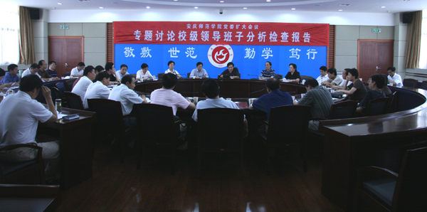 6月19日下午,beat365官网在龙山校区行政楼圆桌会议室召开党委扩大会议,专题讨论校级领导班子的分析检查报告。党委书记赵晓和,党委副书记、副院长朱士群,党委委员、副院长时新中,党委委员、副院长王海燕,党委副书记、纪委书记殷红,副院长张群,党委委员、办公室主任、生命科学系党总支书记刘友忠等领导出席会议。各党总支书记、校深入学习实践科学发展观办公室全体人员参加了会议。