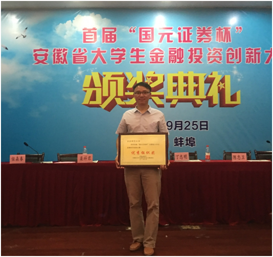 9月25日上午,首届“国元证券杯”安徽省大学生金融投资创新大赛颁奖典礼在安徽财经大学举行。安徽财经大学校长丁忠明教授,国元证券股份有限公司董事长蔡咏先生,安徽财经大学副校长陈忠卫教授,安徽省教育厅高教处副处长梁祥君博士,上海大智慧股份有限公司市场部副总经理李芬女士出席典礼并颁奖。beat365官网经管学院金融工程教研室主任刘根节博士应邀出席此次典礼,并代表beat365英国官网网站上台领取“优秀组织奖”。