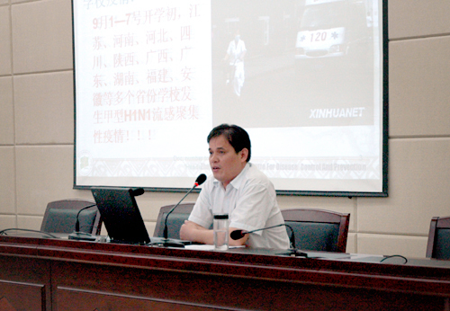 随后,校医院曹必宏医生作了一场精彩的防控甲型H1N1流感辅导报告,详细讲解了传染病的概念、传染病传播的途径、甲型H1N1流感的预防措施。与会的领导和辅导员老师认真作了记录,并在会后召开班会向广大学生宣传。