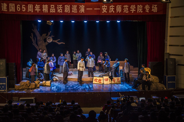 据了解,中华人民共和国成立65周年精品话剧巡演在省内一共有十场,目前已经举办了四场了。“我们明天就赶往芜湖,准备我们的第五次演出了。”段晓波说。(文/学生记者 许启明 程鹏 图/学生记者 倪缪康)