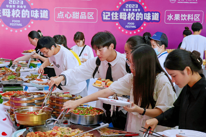 色泽鲜美的山粉圆子烧肉、鲜香满溢的老鸡汤泡炒米、秀色可餐的安庆十样菜……美食节内场自助餐共设20余种安庆特色菜品,外场美食摊点的各式佳肴种类丰富,高达50余种,香气四溢。毕业生在参加完毕业典礼后迫不及待赶来西苑食堂,品尝“母校的味道”。活动现场,学校为2023届毕业生配发了免费餐券。