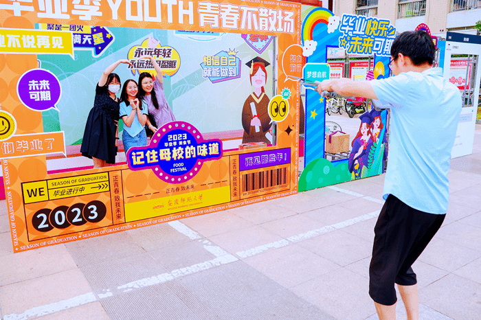 在西苑食堂广场的侧面,六个印有毕业寄语的合影相框吸引了不少学生前来“打卡”。身着学士服,毕业生们与各自的好友站在标有“青春不散场”的相框前合影留念。