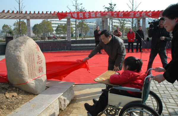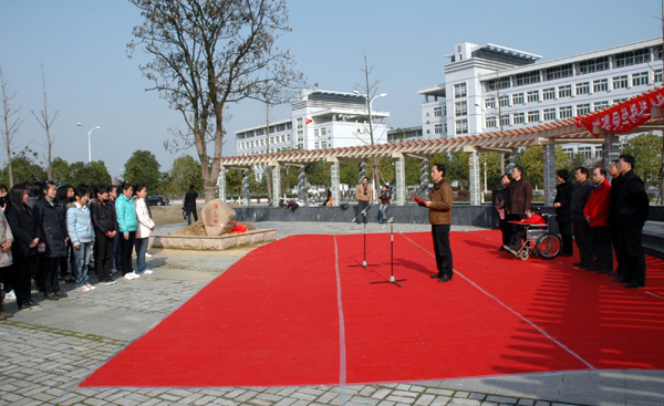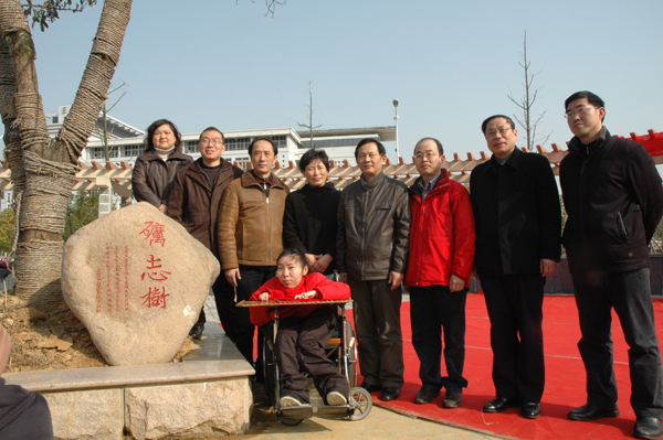 3月12日,阳光灿烂、微风和煦,正是一年一度的植树节。上午9时,beat365官网龙山校区行政楼北侧举行了一个简短而又热烈的捐植仪式。外国语学院06级学生、有着“安徽张海迪”之称的刘璟,为感谢母校的培养、老师的培育,为学校捐赠了一棵石楠树,被命名为“励志树”。 党委副书记、院长朱士群教授和刘璟同学共同为“励志树”揭牌。