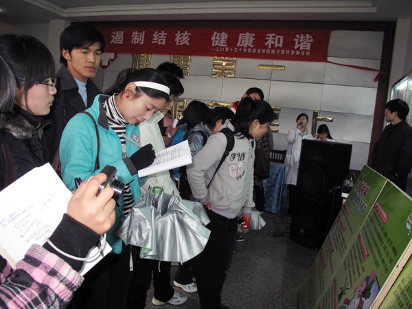 3月24日是第15个“世界结核病防治日”,校医院、团委、学生会在校医院一楼大厅开联合举办了以“遏制结核 健康和谐’为主题的健康咨询宣传活动。本次活动旨在通过宣传、咨询使同学们了解结核病的流行形势及对人群的危害,掌握结核病防治相关知识,遏止结核病的传播以及政府免费治疗肺结核病人的优惠政策,更好地动员全社会共同参与结核病防治工作活动。