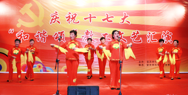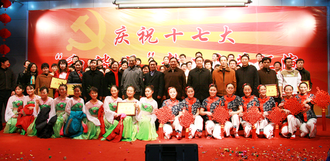 晚会在政法学院分会一曲雄壮的的《中国中国鲜红的太阳永不落》中拉开了帷幕。当晚,教职员工们演出了秧歌、小快板、京剧、小品、歌曲演唱、现代舞、乐器合奏等丰富多彩、精彩纷呈的节目,离退休分会带来了精心准备的节目小快板《喜庆十七大》,赢得了热烈的掌声。高潮迭起的晚会现场始终洋溢着欢乐的节目气氛,展示学校教职员工将在新的一年里,团结一心、共创美好未来的前景。晚会在文学院分会合唱团演唱的《歌唱祖国》的歌声中落下帷幕!