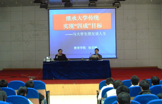 3月19日下午,教育学院张启树副教授在菱湖校区图书馆学术报告厅作了题为《继承大学传统,实现“四成”目标》的报告。报告会由教育学院副院长朱式庆主持,教育学院各班级学生干部代表和 “学业预警”的 130余名学生聆听了报告。
