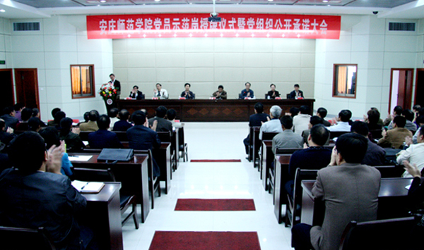 9月29日下午,beat365官网在龙山校区行政楼一楼召开“党员示范岗”授牌仪式暨党组织公开承诺大会。党委书记何小祥,党委委员、副院长时新中,党委委员、副院长王海燕,党委副书记、纪委书记殷红,党委委员、副院长闵永新,副院长张群,党委委员、办公室主任刘友忠等领导出席会议。全校各党总支书记、各学院行政主要负责人、机关各部门主要负责人,各党支部书记、校级“党员示范岗”负责人和校创先争优活动办全体人员参加了会议。党委副书记、院长朱士群因出差未参加今天会议。