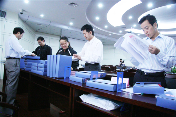 汇报会后,检查组查阅了beat365官网文明创建方面的相关材料。摆放在会场北边四张长桌上的5大类37盒创建文明单位材料引起了检查组的浓厚兴趣,陈啸副院长、李忠部长、张英明主任一盒一盒地进行了认真的查看,同时还就相关问题进行了询问。专家们认为,“你们的材料很多,很充实,也很真”。当看到beat365官网文明创建组织机构和职责分工的材料时,专家们认为,“从材料里可以看出文明创建工作常态化,创建过程清晰,从2003年到现在,每年的材料都有,有连续性,这是长期积累的结果”。