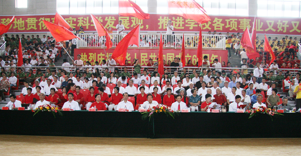 9月25日下午1时30分,龙山校区体育馆里红旗招展,数十面红旗在青年学子的挥舞下,虎虎生风。看台上坐满了师生,每个人都手中都拿着一面小国旗,不时地挥舞。数千平方米的体育馆仿佛成了红色的海洋。激昂的音乐,如潮的欢呼,让人不禁心潮澎湃、豪情满怀。这里既有白发苍苍的老人,也有青春朝气的学生。他们早早用了午饭,就来到了这里。虽然没有休息,可是他们却没有丝毫的疲惫,每个人脸上洋溢着激动、欢快。