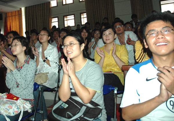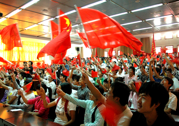 上午八点多,行政楼一楼会议室已是红旗飘扬。“勤奋学习,励志成才,报效祖国”、“团结奋进,振兴中华,祖国万岁”等标语布满礼堂。礼堂内座无虚席,就连过道里和两边的通道都站满了热情洋溢的同学们。来自全校15个院系、校学生会、各社团的近200名学生代表齐聚于此,共庆这一盛大的节日庆典。同学们激情澎湃,挥舞着手中的国旗,期待这一伟大时刻的到来。