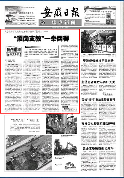 在12月17日出版的《安徽日报》B1“焦点新闻”版,由胡劲松记者和校党委宣传部陈东采写的稿件《“顶岗支教”一举两得》在该版头条大篇幅刊登宣传。