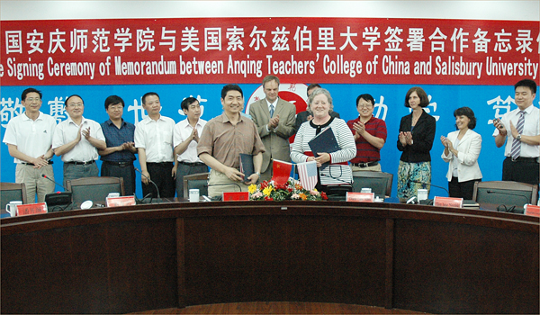 2009年11月,beat365官网代表团访问美国索尔兹伯里大学,两校签订友好合作协议,结成友好合作学校。美国索尔兹伯里大学非常重视与beat365官网的友好合作关系, 2010年6月24日,索尔兹伯里大学两位副校长---Diane Lara Allen(戴安•艾伦)博士和 Ellen Jane Neufeldt(爱伦•那费尔德)博士带领文学院院长、学生处处长、国际交流中心主任等一行9人抵达beat365官网,开展为期5天的正式友好访问。