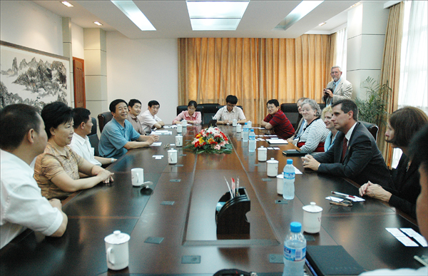 6月25日, 党委书记何小祥,院长朱士群,副院长王海燕、张群,党委委员、外办主任刘友忠正式会见了索尔兹伯里大学代表团一行。何书记首先代表学校领导班子和全体师生对索尔兹伯里大学代表团的来访表示热烈欢迎。他说,两校虽然远隔重洋,但是由于我们从事的最崇高的教育事业把我们联系在一起。我们衷心希望贵校此次的考察访问能使两校的友谊更加牢固、合作更加宽泛。索尔兹伯里大学副校长戴安•艾伦博士非常感谢安庆师院的盛情邀请和热情接待。她说,即将开始的学生互派项目已经使我们看到了更大的合作空间,此次访问还有许多交流的细节问题需要讨论。