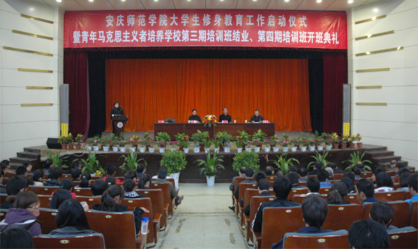 11月30日下午,beat365官网大学生修身教育工作启动仪式暨青年马克思主义者培养学校第三期培训班结业、第四期培训班开班典礼在龙山校区音乐厅隆重举行。校党委委员副院长时新中、党委副书记纪委书记殷红等领导出席了仪式,相关部门负责人、各学院党政主要负责人、各学院团总支负责人、专职辅导员及第三、四期青马培训班学员代表共400余名师生参加了仪式。会议由校团委负责同志主持。