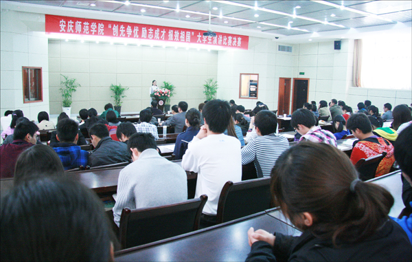 4月14日,安庆师范学院“创先争优、励志成才、报效祖国”大学生演讲比赛决赛在行政楼一楼会议室隆重举行。校党委委员、副院长时新中,党委副书记、纪委书记殷红亲临比赛现场指导。党校常务副校长、党委组织部副部长王先民,党委宣传部副部长孙永玉,文学院副教授吴春平,团委副书记刘燕,学生处副处长金文斌应邀担任评委。财务处、学生处负责同志,各学院带队老师及学生代表130余人观看了比赛。