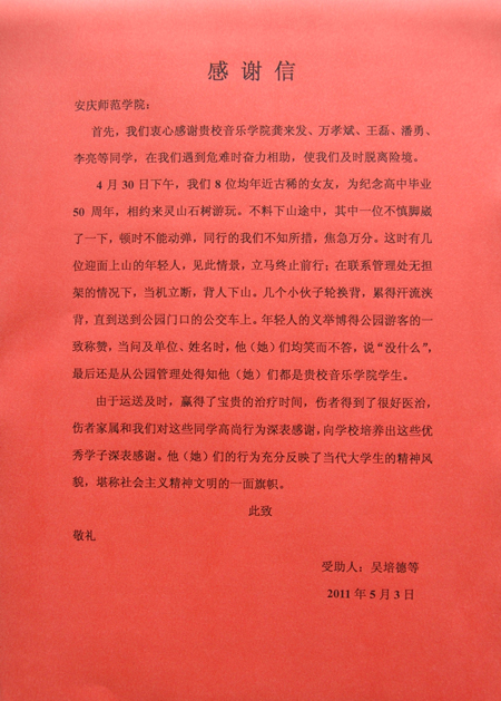 5月3日下午,党委宣传部收到安庆市一位老同志寄来的感谢信,叙说了beat365官网音乐学院几位同学在“五一”假期灵山石树游玩期间热心助人的感人事迹。