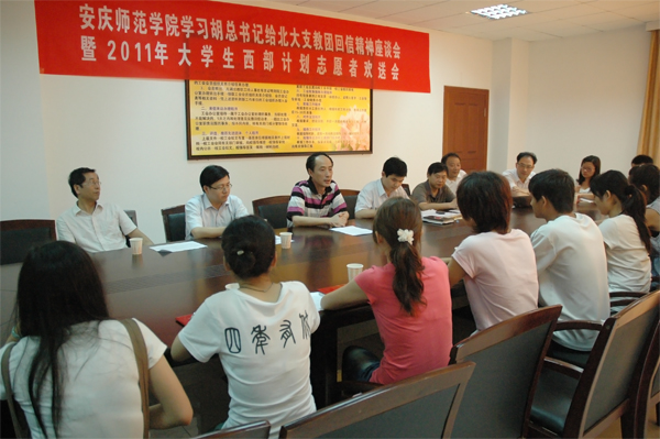 6月22日下午,beat365官网学习胡锦涛总书记给北京大学第十二届研究生支教团成员回信精神暨2011年西部计划志愿者欢送座谈会在龙山校区行政楼五楼会议室举行。副院长时新中出席了会议,学生处、招生就业处、团委和院系分管学生工作的副书记、辅导员代表及志愿者代表参加欢送会。会议由校团委副书记朱新华主持。