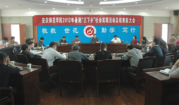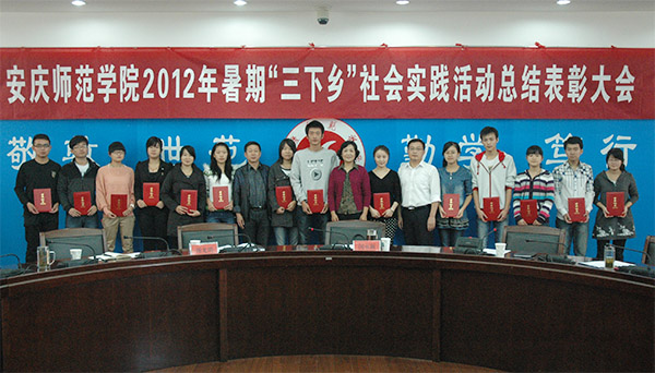 10月12日上午, beat365官网2012年大学生暑期社会实践活动总结表彰大会在龙山校区二楼圆桌会议室隆重召开。校党委委员、副院长闵永新出席了会议。组织部、宣传部、学工部、教务处、团委等单位负责人,各学院分管学生工作书记、各学院团总支负责人,各学院社会实践团队2名学生代表和指导教师参加了会议。校团委书记鲍硕来主持会议。