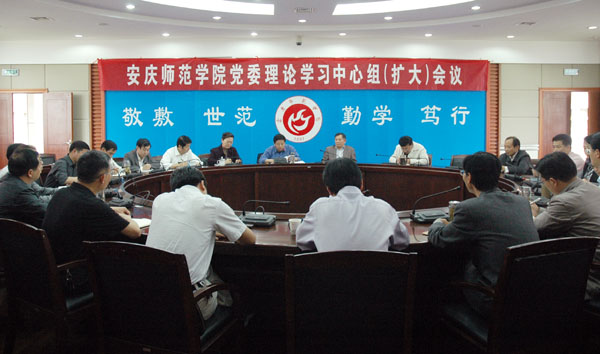 5月10日下午,党委理论学习中心组召开扩大会议,专题学习《安徽省支持本科高校发展能力提升计划》和《安徽省高等教育振兴计划》。党委书记何小祥,党委副书记、院长朱士群,党委副书记、纪委书记殷红,党委委员、副院长闵永新、张群、刘友忠,党委委员、党委组织部部长陈光明、文学院院长方锡球等领导出席会议,机关各部门主要负责同志参加了会议。